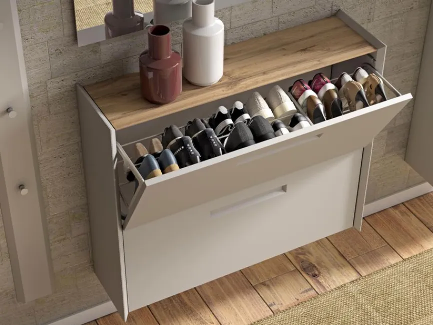 - Garderobe aus 2 Garderobenpaneelen, Hänge-Schuhschrank, Spiegel und Hänge-Mehrzweckschrank
