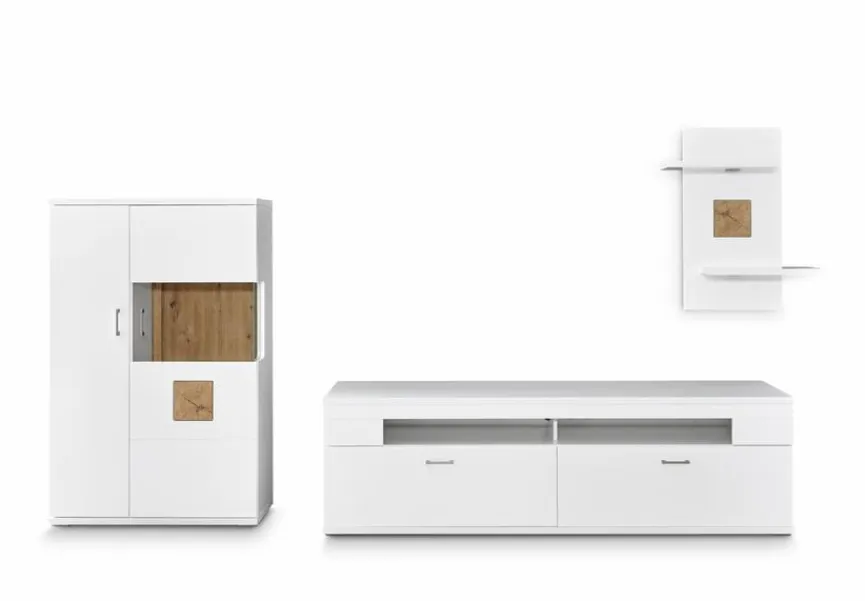 Die Wohnwand Topeka zeichnet sich durch eine klare Formensprache und ein helles Design aus, wobei optisch abgesetzte Details für attraktive Kontraste sorgen. Sie erhalten mit dem Set gleich drei Möbelstücke auf einmal. Neben einem TV-Board enthält die Wohnwand Topeka einen Schrank und ein Hängeregal, sodass Sie von einem großzügigen und vielseitigen Platzangebot profitieren.