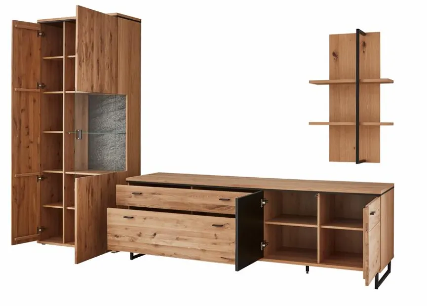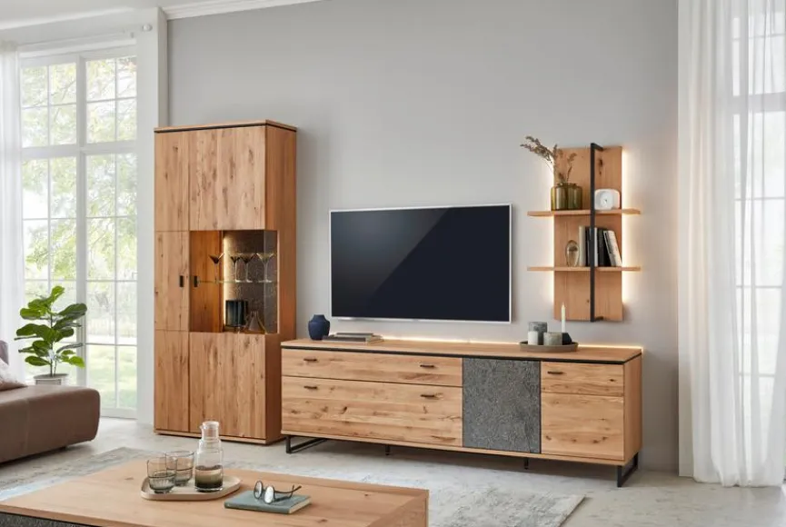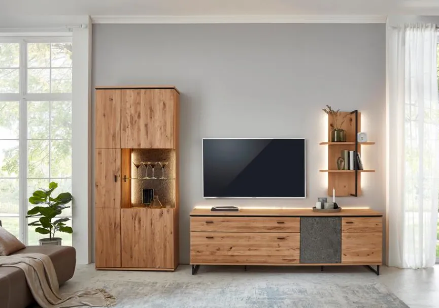 - Wohnwand bestehend aus Vitrine, TV-Lowboard, Wandregal