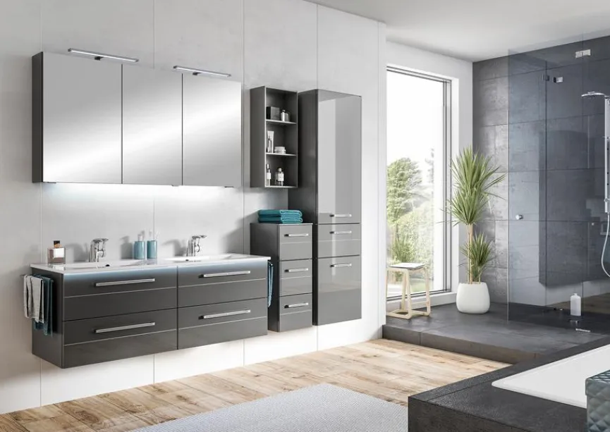 - Front aus Holzwerkstoff (MDF) mit Folie in Rillenoptik Quarzgrau Hochglanz Select, Korpus aus Holzwerkstoff (Spanplatte) in Quarzgrau Hochglanz Touch