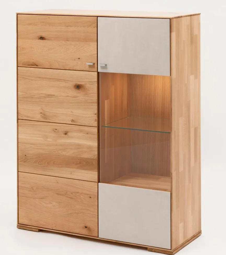 Mit natürlicher Ausstrahlung und hoher Materialqualität überzeugt das Highboard Sabrina von Boegner. Die Kommode begeistert mit einem harmonischen Design aus klaren Linien, schlichter Eleganz und exquisitem Look. Hinter seinen beiden Türen bietet das Highboard Sabrina reichlich Stauraum für wertvolle Dinge, und hinter den edel beleuchteten Glaselementen lassen sich schöne Deko-Objekte in Szene setzen.