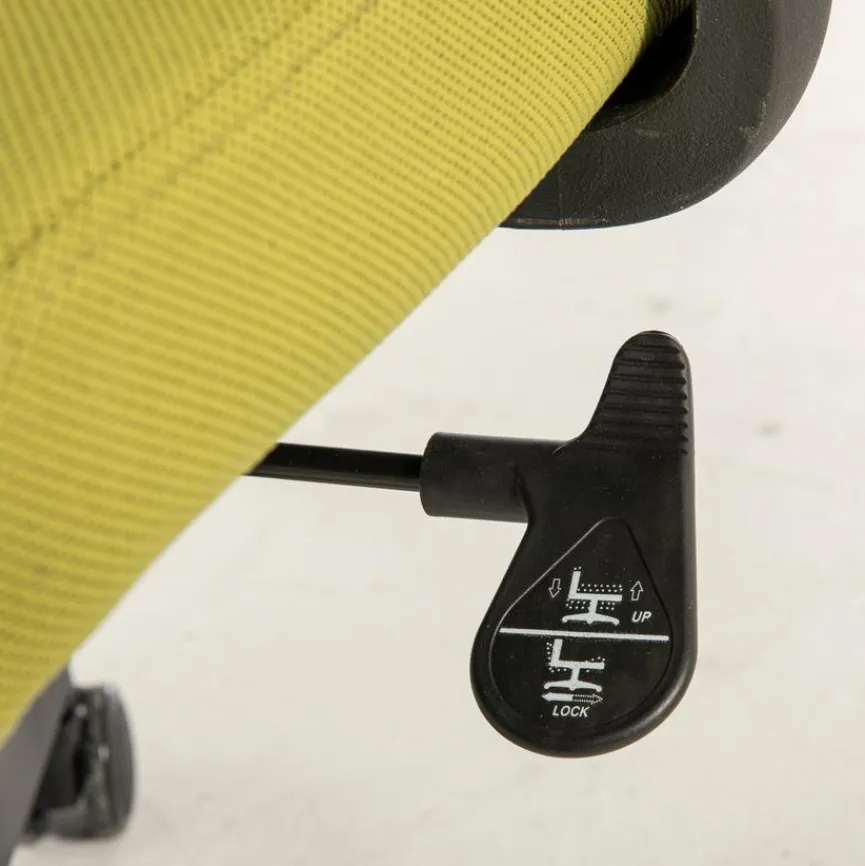 - Sitzbezug aus Stoff in grün, Rücken aus atmungsaktivem Netzbezug in schwarz, Fußkreuz aus Kunststoff in schwarz