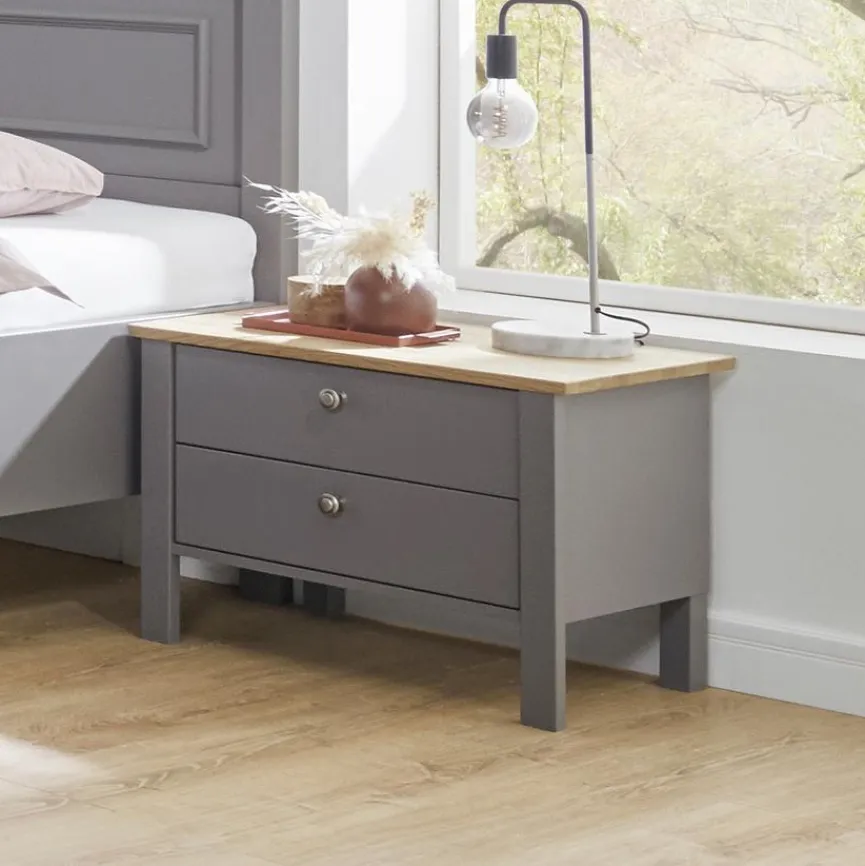 - Aus Echtholz furniert mit Lack in Manhattan, Nachttisch-Ablage, Kopf- und Fußteilakzent aus Wildeiche