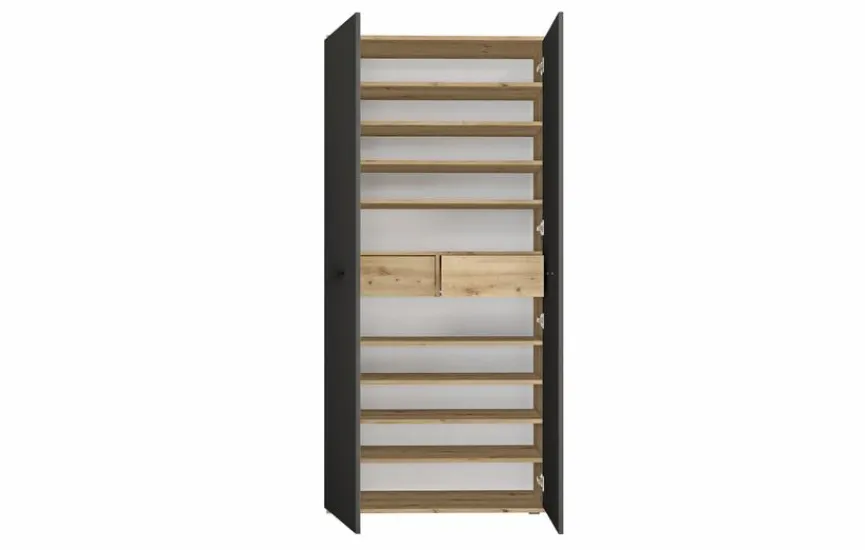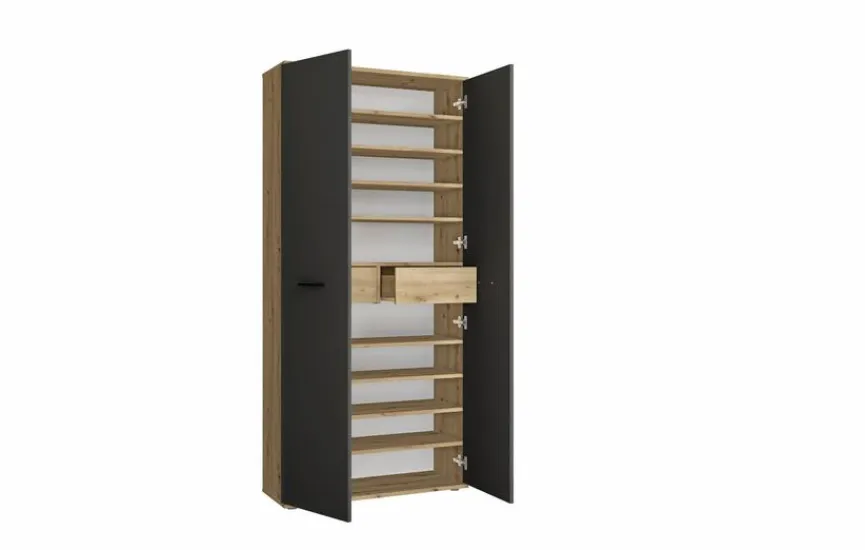 Wenn Sie im Flur oder Eingangsbereich für Ordnung sorgen wollen, zeigt sich der Garderobenschrank Leon als perfekter Helfer. Der Dielenschrank punktet durch schlichte Optik, edles Design und hohe Funktionalität. Hinter seinen beiden Türen bietet der Garderobenschrank Leon auf neun Böden und in zwei Schubfächern reichlich Platz für Schuhe, Accessoires und sonstige Dinge, die Sie unterbringen möchten.