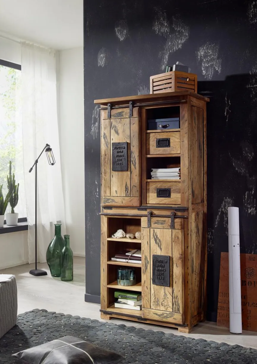 Wer ausgewählte Möbelstücke mit Blickfangqualitäten zu schätzen weiß, wird von dem trendigen Highboard Railway begeistert sein. Das Holz im Used-Look und die Türapplikationen aus Gusseisen verleihen dieser Kommode einen unverwechselbaren Look. Zudem bietet Ihnen das Highboard Railway in den offenen und geschlossenen Fächern sehr viel Stauraum für diverse Utensilien.