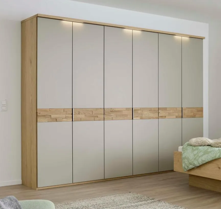 - Schrankkorpus mit Echtholz furniert in Balkeneiche, Front aus Echtholz furniert in Lack taupe mit Bauchbinde in massivem Spaltholz
