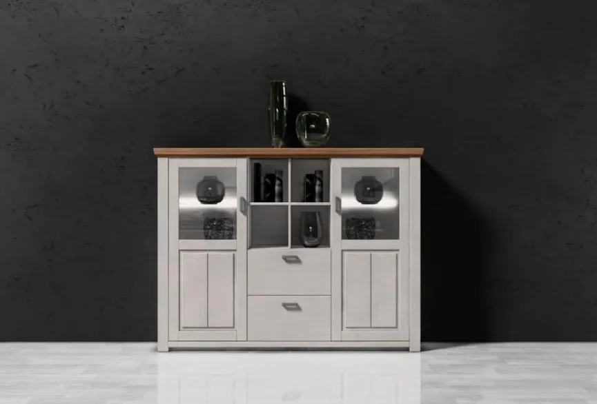 - Highboard besteht aus: 2 Glas/Holztüren links + rechts, 2 Schubkästen mittig, 2 Glaseinlegeböden, 1 Holzboden + 1 Konstruktionsboden links, 1 Holzboden + 1 Konstruktionsboden rechts, 4 Nischen/offene Fächer