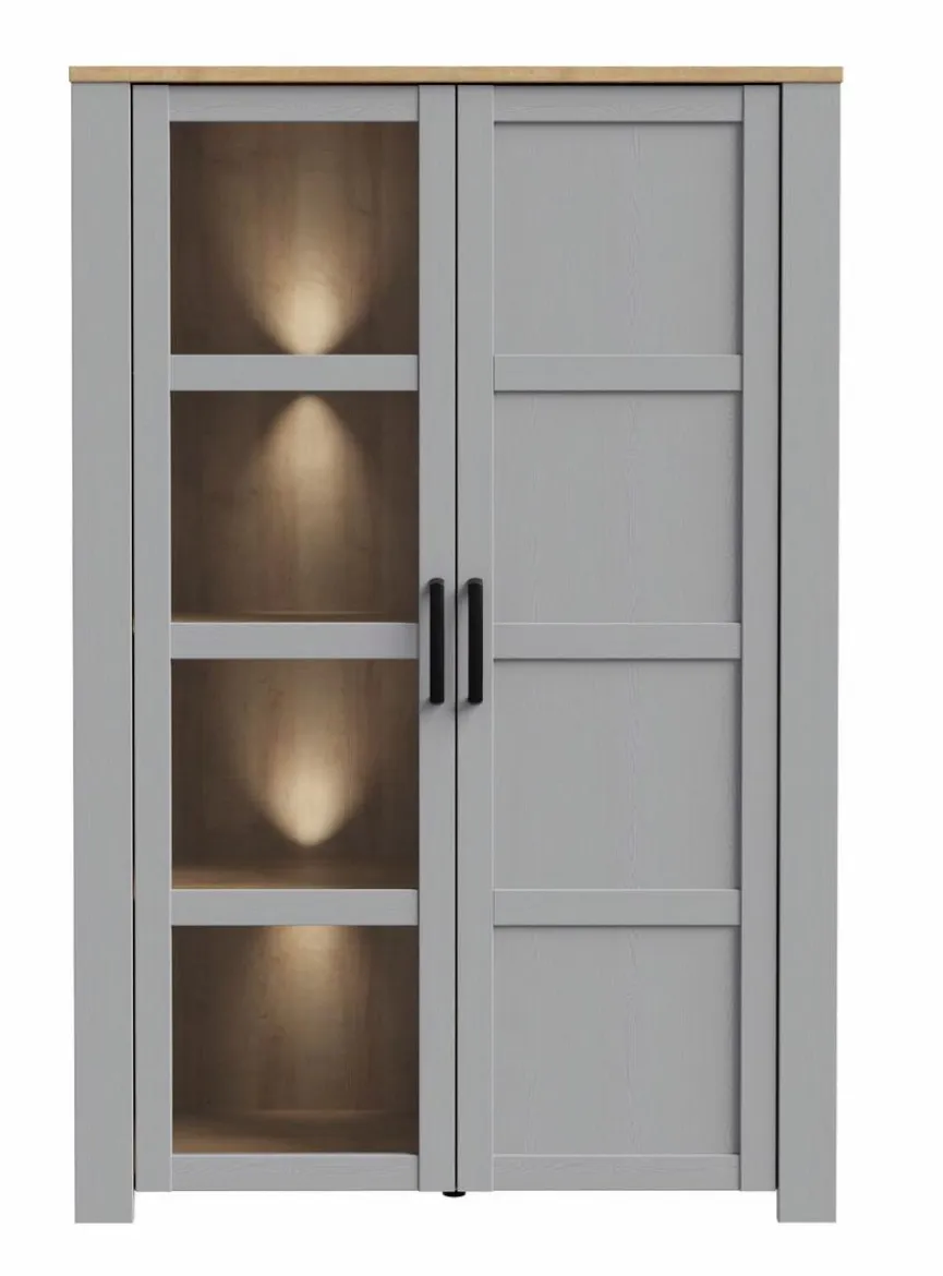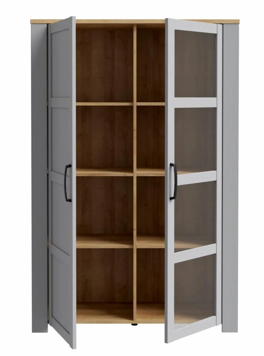 - Rückwand besteht aus Holzwerkstoff (HDF) in Eiche Grau, Korpus besteht aus Holzwerkstoff (Spanplatte) in Eiche Grau. Front besteht aus Holzwerkstoff (MDF) in Eiche Grau. Absetzung in Riviera Eiche mit Kratzfester Melaminharzfolie