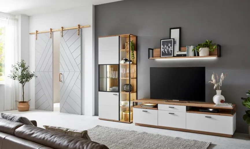 - Wohnwand bestehend aus Vitrine, TV-Lowboard und Wandboard