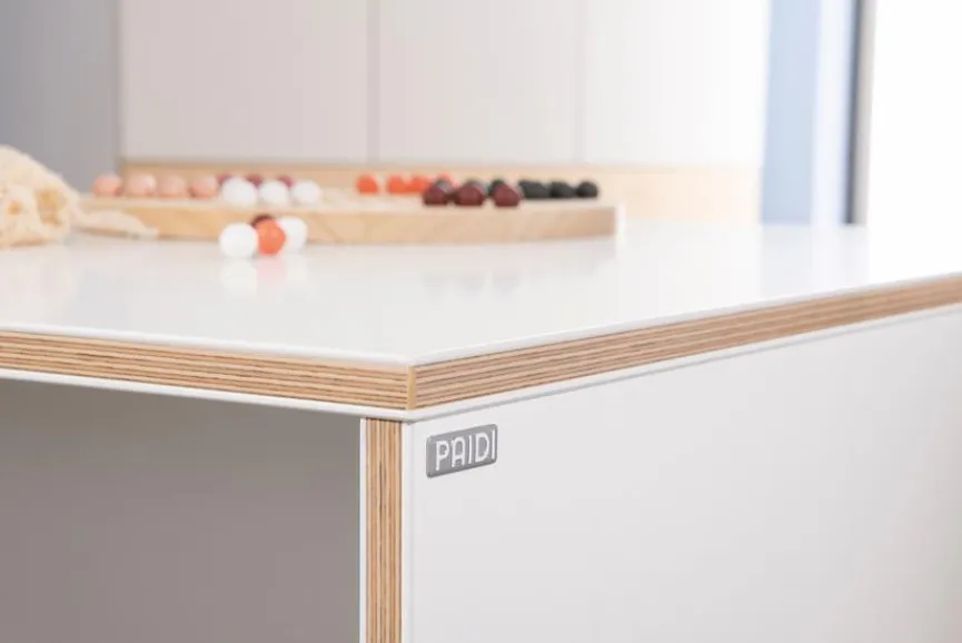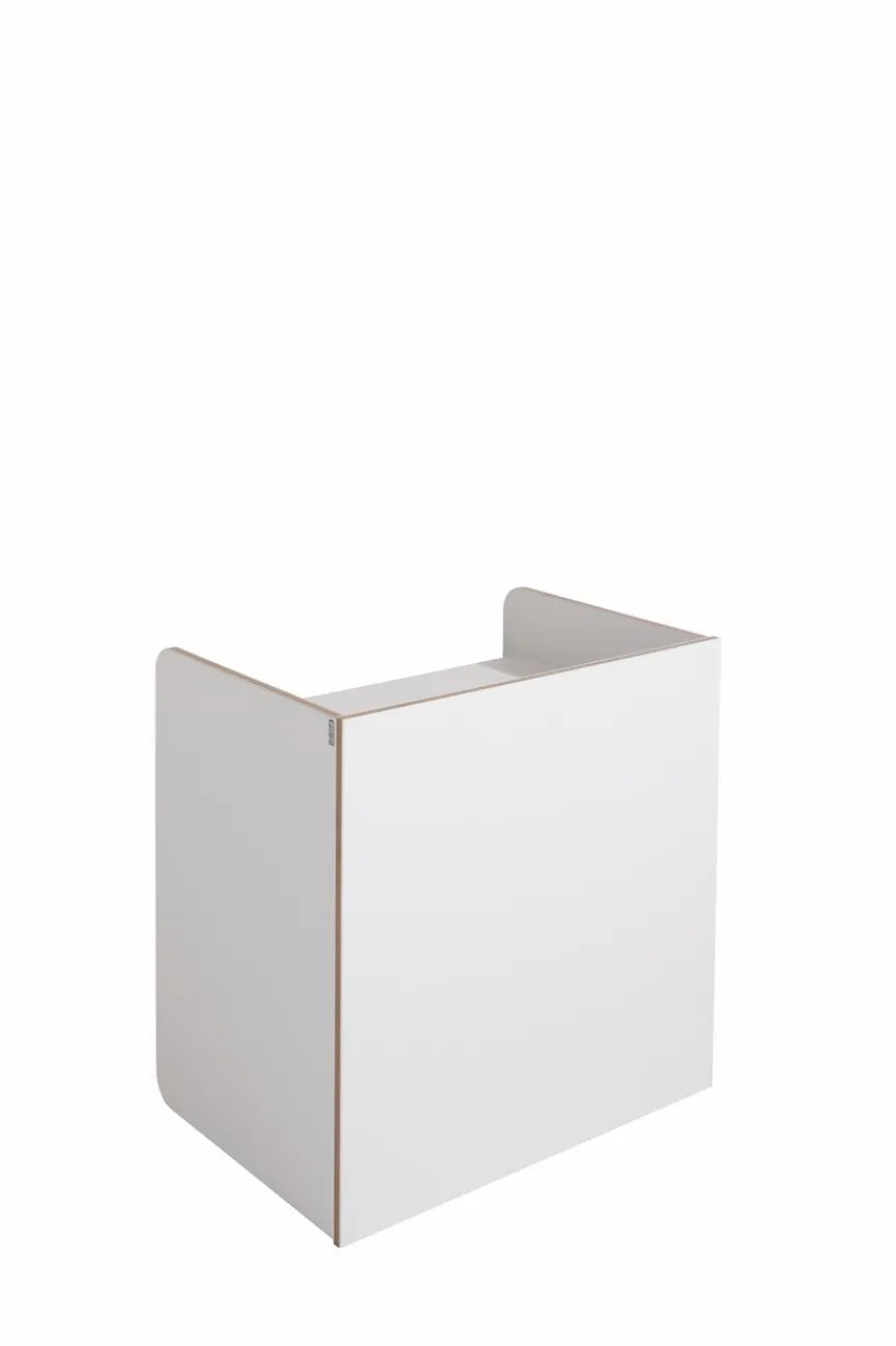 - Aus Holzwerkstoff mit kratzfester Melaminharzfolie in weiß mit Multiplexkante (Kante bestehend aus mehreren Furnierlagen)