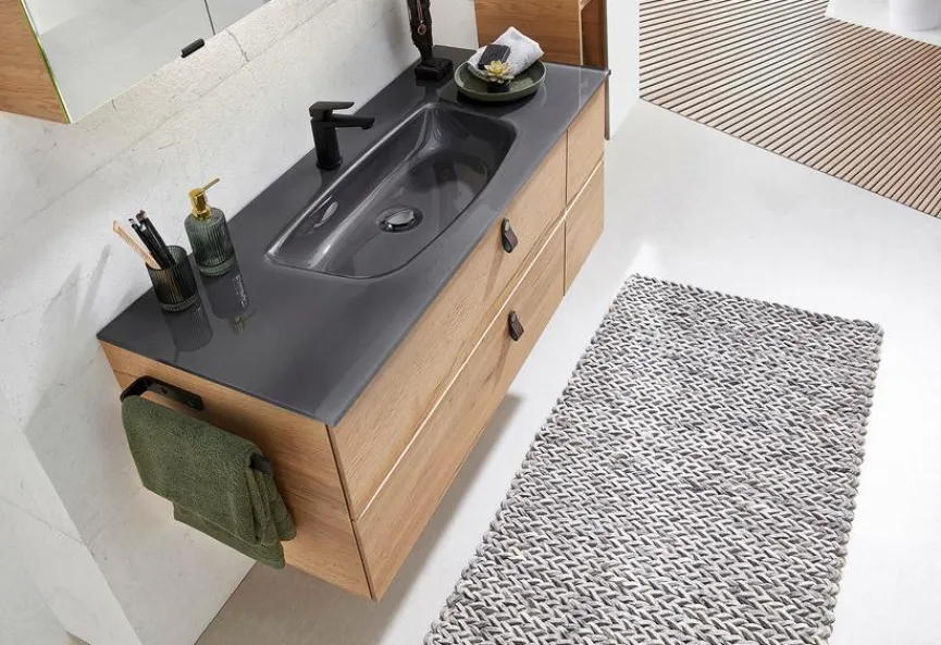 - Waschtischunterschrank mit 2 Auszügen und mit asymmetrischer Frontoptik (rechts)