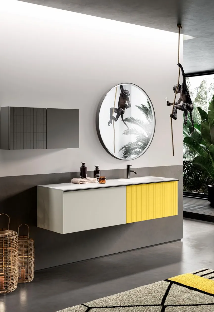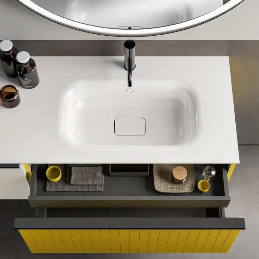 - Waschtischunterschrank mit 1 Auszug und 1 integrierten Schublade mit der Fronttype Grid in sonnengelb matt lackiert