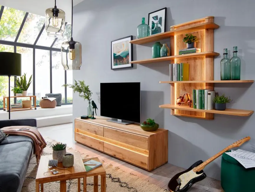 Die Wohnwand MIssouri 2tlg. besteht aus einem Regal und einer flachen Kommode. Beide Stücke sind in natürlichem Design gehalten. Im Regal finden beispielsweise Bücher und Dekorations-Objekte ihren Platz. Sie werden durch die LED-Beleuchtung in das richtige Licht getaucht. Auch die Kommode der Wohnwand MIssouri 2tlg. enthält die Beleuchtung.