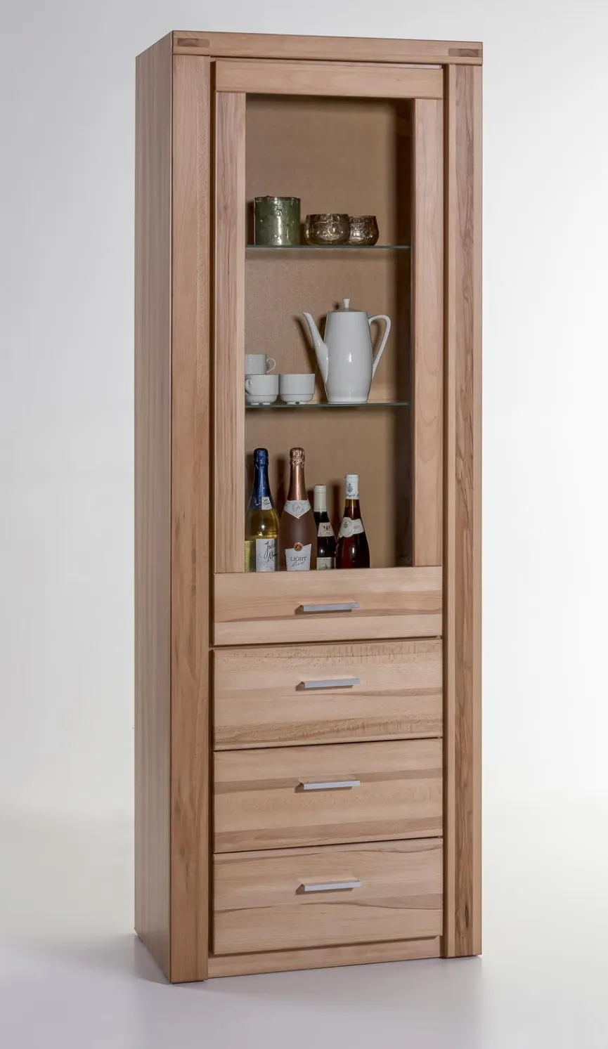 Fronten aus geöltem Massivholz verleihen der Vitrine Tabea eine sehr wohnlich wirkende Optik, die sehr viel Wärme und Gemütlichkeit ausstrahlt. Aber auch die moderne Note kommt bei dieser Glasvitrine nicht zu kurz. Grund hierfür ist die geradlinige, puristische anmutende Formgebung, mit der die Vitrine Tabea aufwartet.
