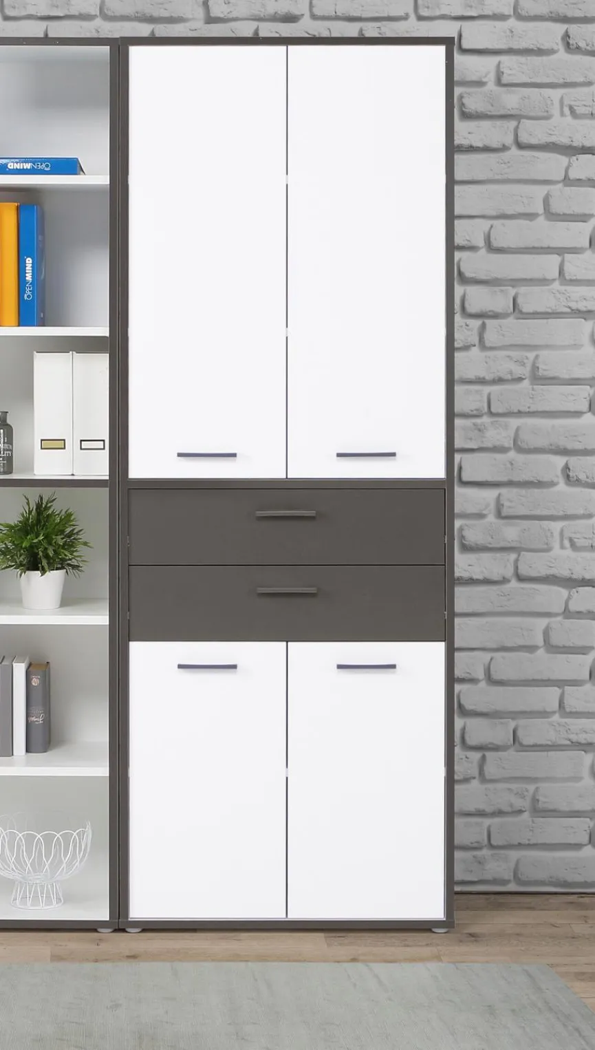 - Aus Holzwerkstoff (Spanplatte) in Weiß, Kontrastkante und Schubkästen aus Holzwerkstoff (Spanplatte) in Uni Wolfram Grau, Rückwand aus Holzwerkstoff (HDF-Platten) in Weiß, Griffe aus Kunststoff in Grau