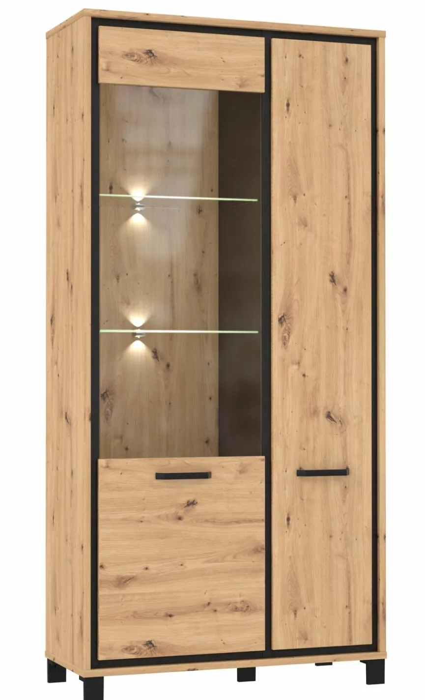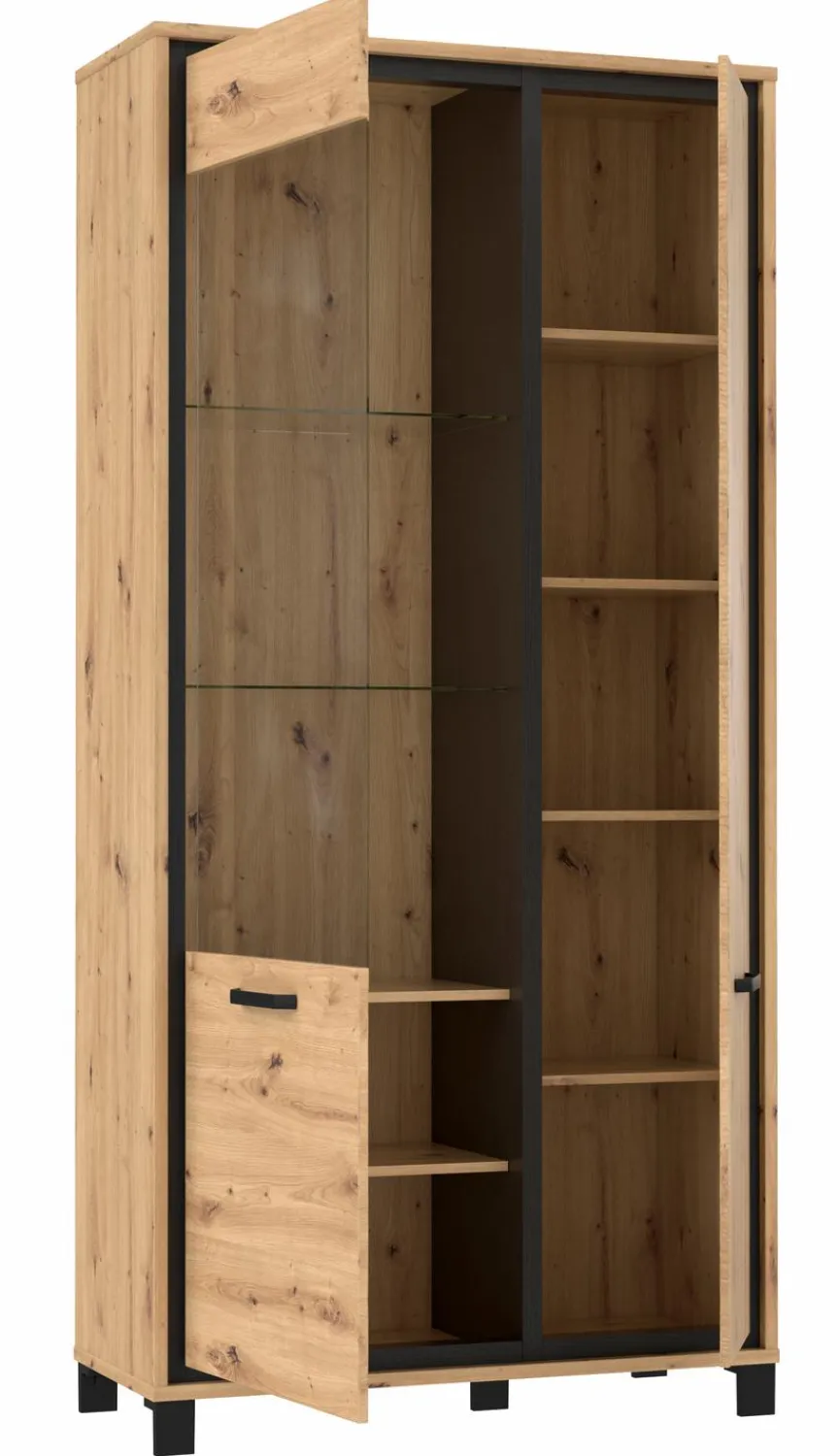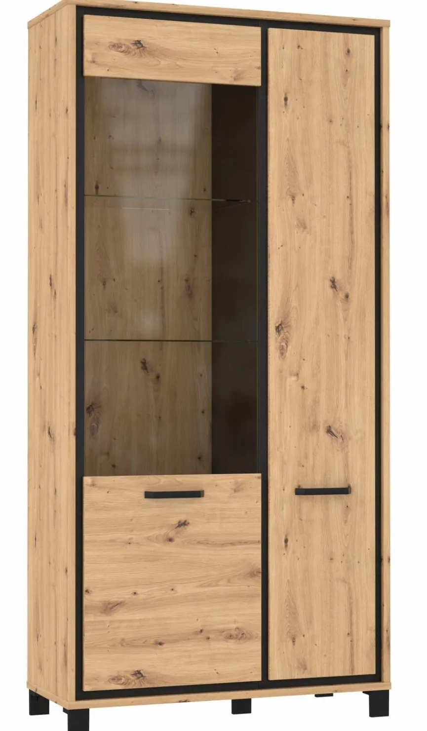 - Aus Holzwerkstoff (Spanplatte) mit hochwertiger Dekorfolie in Artisan Eiche, Absetzungen in Eiche schwarz