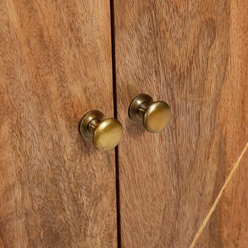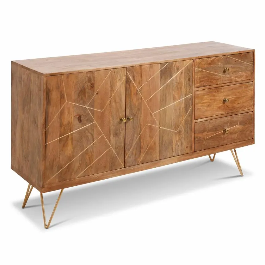 Das Sideboard Scan ist mit seinen schräg gestellten, goldfarben lackierten Füßen und den Einfräsungen im Frontbereich eine Kommode, die alle Blicke auf sich zieht. Mit zwei Holztüren und drei Schubkästen bietet das Sideboard Scan ausreichend Stauraum. Schubladen und Türen werden mit goldfarben lackierten Knöpfen geschlossen. Der Schrank aus hochwertigem Holz ist ein Highlight in jedem Wohnbereich.