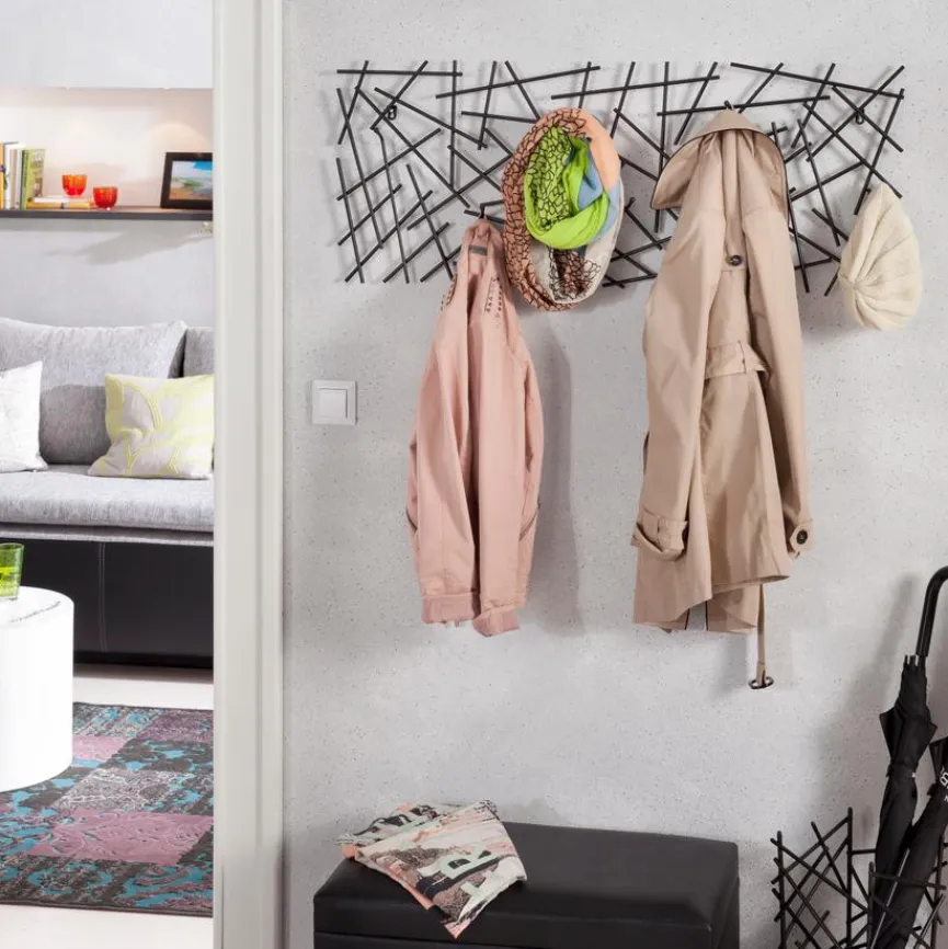 Die originelle Wandgarderobe Melilla bringt verspielte Kreativität in jede Wohnung. Aus vielen miteinander verbundenen Metallstäben bestehend wird die Wandgarderobe überall zum ansprechenden Blickfang. Die passend in das Muster integrierten Haken ermöglichen ein sicheres Aufhängen der Kleidungsstücke. Dank der Lackierung wirkt die Wandpaneele Melilla besonders edel und elegant.
