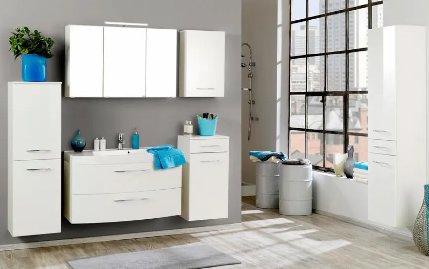 Der Spiegelschrank Florida von Held-Möbel bietet eine große Spiegelfläche mit breiter Ausleuchtung, um Ihre morgendliche Routine zu erleichtern. Egal ob beim Auftragen von Make-up oder bei der Rasur, mithilfe der LED-Leuchten lässt sich ein ausgezeichnetes Ergebnis erzielen. Außerdem nutzt der Spiegelschrank Florida von Held-Möbel gekonnt die Fläche an der Wand und bietet Ihnen reichlich Platz für Ihre Utensilien.