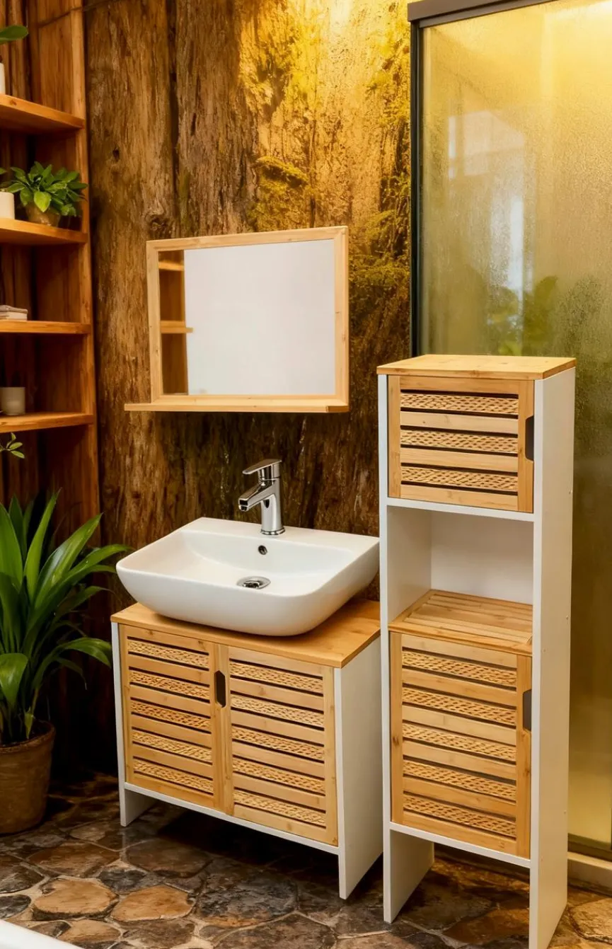 Ein natürlicher Look beschert dem Badezimmer entspannte Spa-Vibes – der Hochschrank Bruce von Hölscher ist dafür ein hervorragendes Beispiel. Er bietet zudem mit zwei geschlossenen Fächern und einem offenen Fach Platz für Kosmetika, Textilien, den Föhn und zahlreiche weitere Utensilien. Der Hochschrank Bruce weist ein klares Design auf, das viel Handlungsspielraum lässt, wenn es darum geht, ihn mit anderen Möbelstücken und Accessoires gekonnt zu kombinieren.