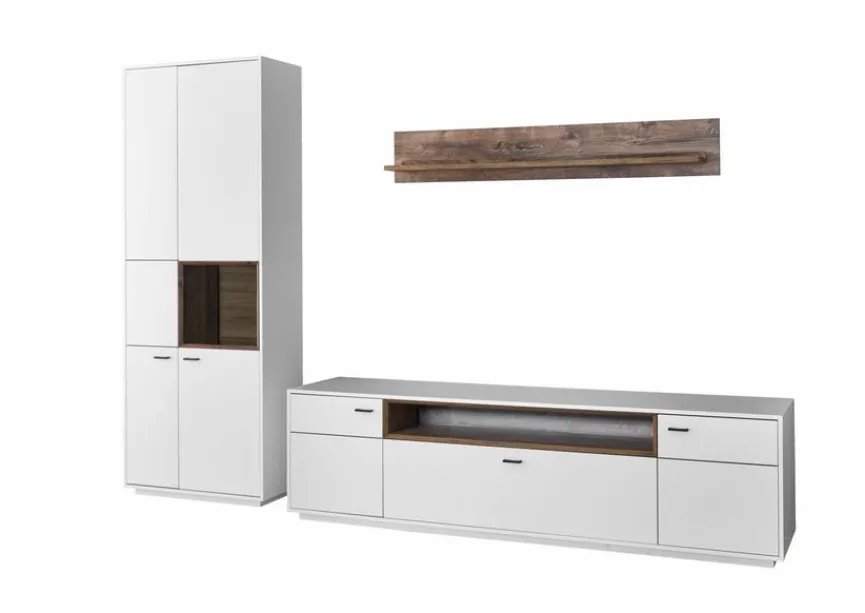 - Wohnwand bestehend aus Vitrine, Wandboard und TV-Lowboard