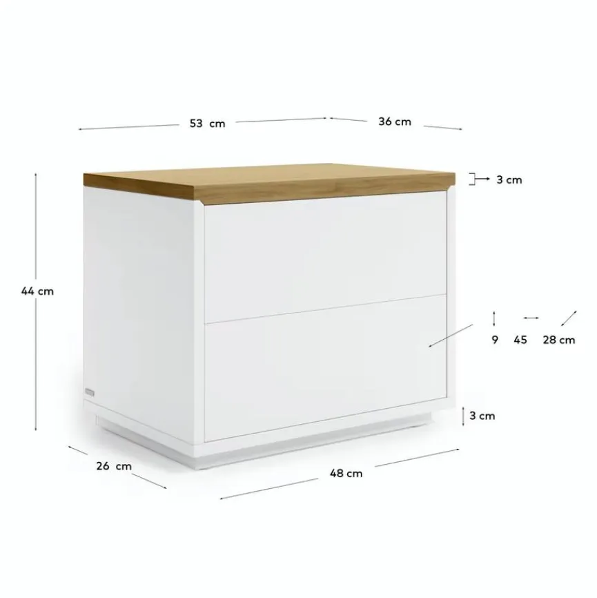 Der Nachttisch Abilen von Kave Home steht für modernes Design mit praktischem Stauraum. Er überzeugt durch seine geradlinige Form und die kompakten Maße, die ideal für kleinere Schlafzimmer sind. Dabei wirkt die Nachtkonsole besonders leicht und elegant. Der Nachttisch Abilen eignet sich auch als Beistelltisch im Wohnbereich.