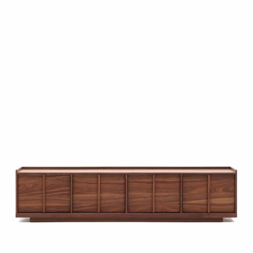 Mit zahlreichen Fächern bietet Ihnen das TV-Lowboard Onix von Kave Home jede Menge Platz, um etwa Medienartikel und Bücher auf stilsichere Art und Weise unterzubringen. Doch dieser TV-Unterschrank ist nicht nur praktisch, er ist auch ungemein geschmackvoll. Vor allem dank des klar strukturierten Designs und der warmen Holzoptik avanciert das TV-Lowboard Onix im heimischen Wohnzimmer zu einem attraktivem Blickfang.