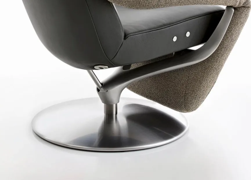 - Bezug Rücken und Kopfteil (1) aus Leder (C-Classic) in pepper mit grauer Kontrastnaht, Bezug Arm- und Fußteil (2) aus Stoff (20-Rain) in beige/grau (93), Fuß Metalldrehteller nickel satiniert (Edelstahloptik)
