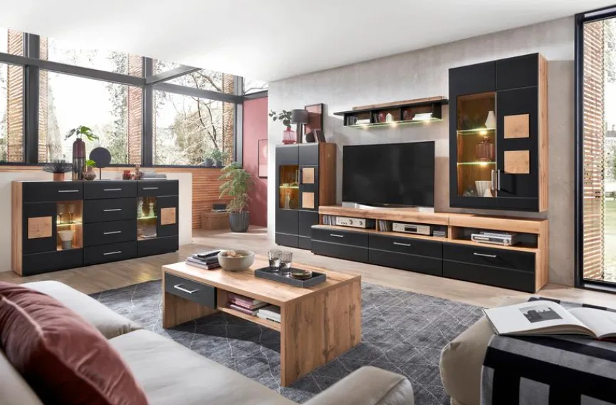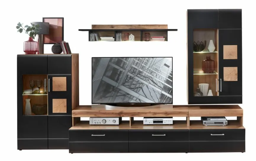 - Bestehend aus: 1 TV-Lowboard, 1 Hängevitrine, 1 Standvitrine und 1 Wandboard