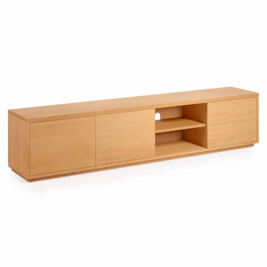 Das TV-Lowboard Abilen der Marke Kave Home bietet hinter zwei Türen und zwei Schubladen viel Stauraum für allerlei Gegenstände. Außerdem lassen sich die Schubladen des TV-Unterschranks dank versteckter Schienen und eines Push-to-open-Mechanismus problemlos öffnen und schließen. Die geradlinigen Formen machen das TV-Lowboard Abilen zu einer idealen Ergänzung für viele Einrichtungsstile.