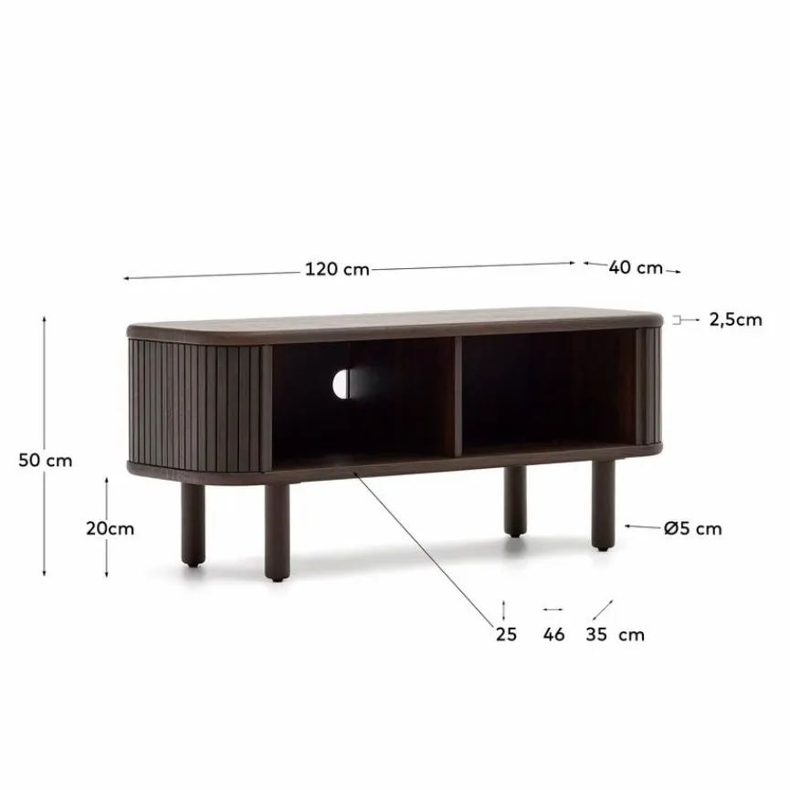 Das TV-Lowboard Mailen von Kave Home verkörpert sachlichen Chic, Extravaganz und Kreativität. Abgerundete Kanten und ein elegantes Lamellendesign, das an klassische Tambour-Rolladenmöbel denken lässt, machen diesen TV-Unterschrank zum Blickfang in Ihrem Zuhause. In einem bewusst schlicht gehaltenen Raum kann das TV-Lowboard Mailen zum Beispiel fantastisch wirken.