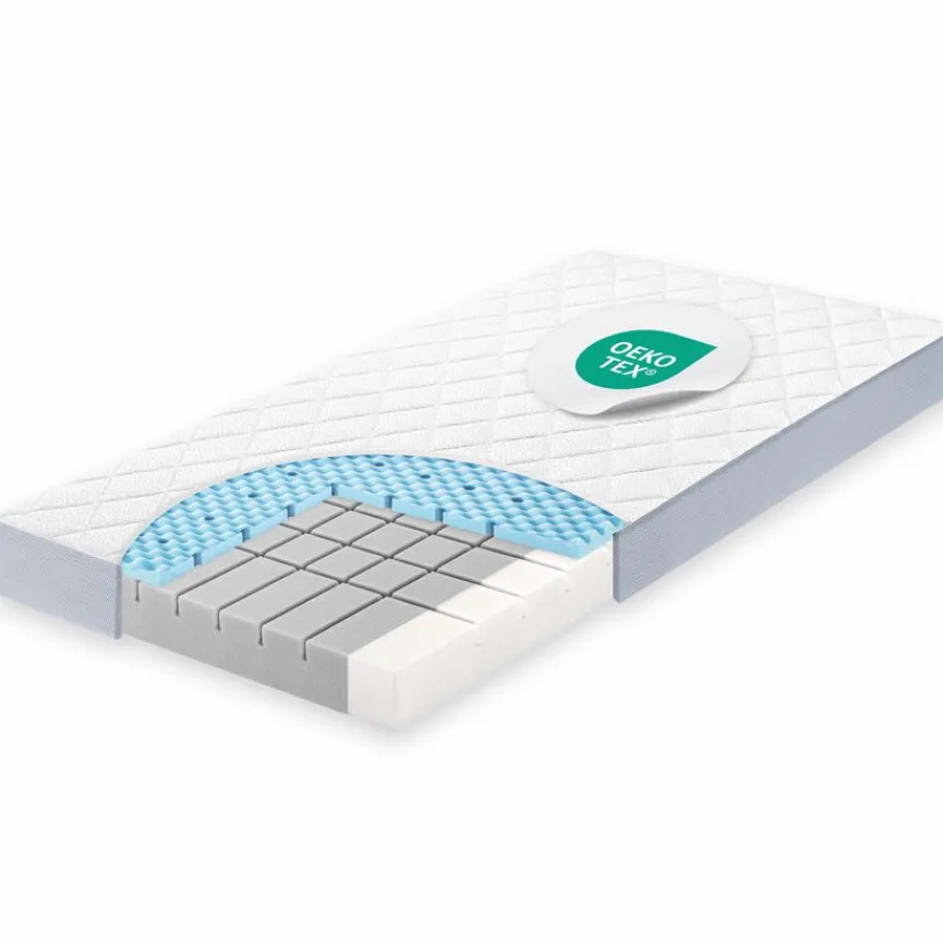 - Mit Noppenprofil und Würfel-Pads auf der Babyseite – für optimale Oberflächenbelüftung, Kaltschaumbasis auf der Kleinkindseite