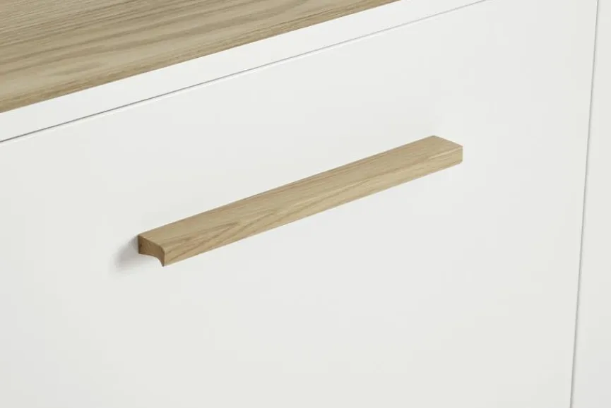 - Aus Holzwerkstoff (Spanplatte) mit kratzfester Melaminharzfolie in Off-White, Absetzung aus Holzwerkstoff (Spanplatte) mit kratzfester Melaminharzfolie in Eiche-Montana-Nachbildung, Griffe aus massiver Eiche