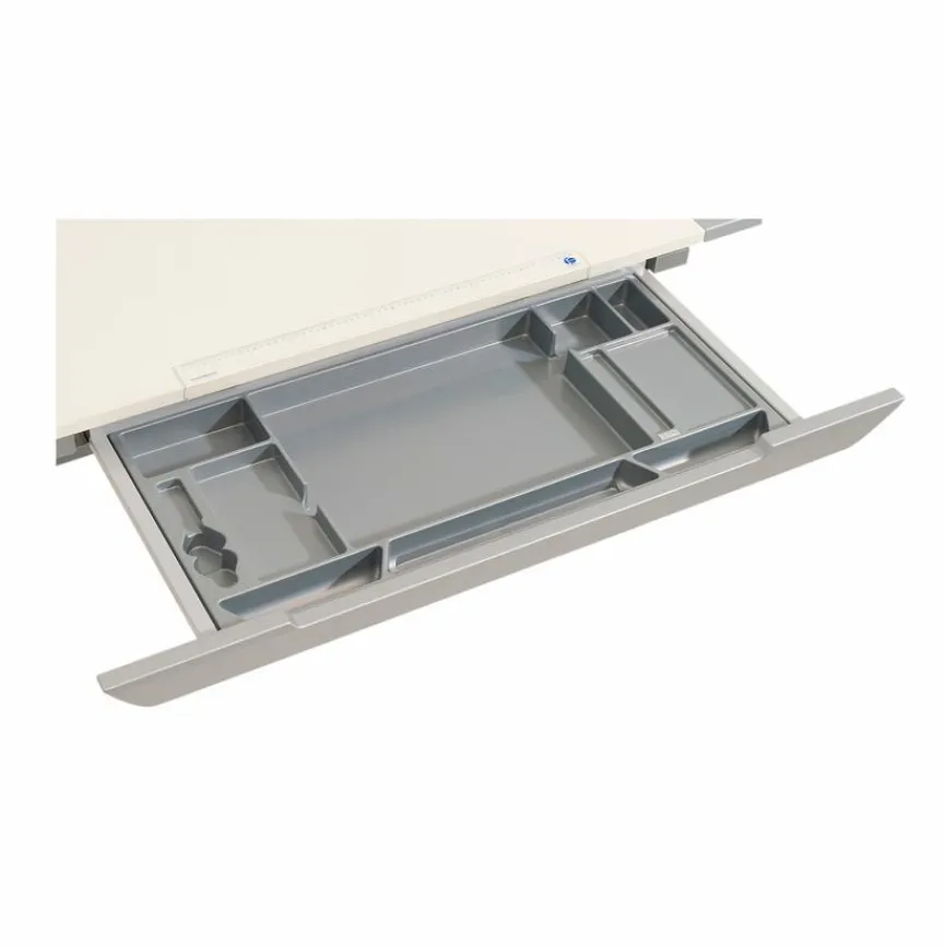 Der Schubkastenauszug Tablo von Paidi ist mit einer unterteilten Ablageschale versehen, welche mit rechteckigen sowie länglichen Fächern für Stifte oder Lineale ausgestattet ist. Der Schubkastenauszug Tablo aus dem Hause Paidi hat eine niedrige Höhe, sodass man eine bequeme Beinhöhe beim Sitzen an der Arbeitsfläche hat. Ganz nach Belieben kann man seine Utensilien in dem Ablagefach unterbringen.