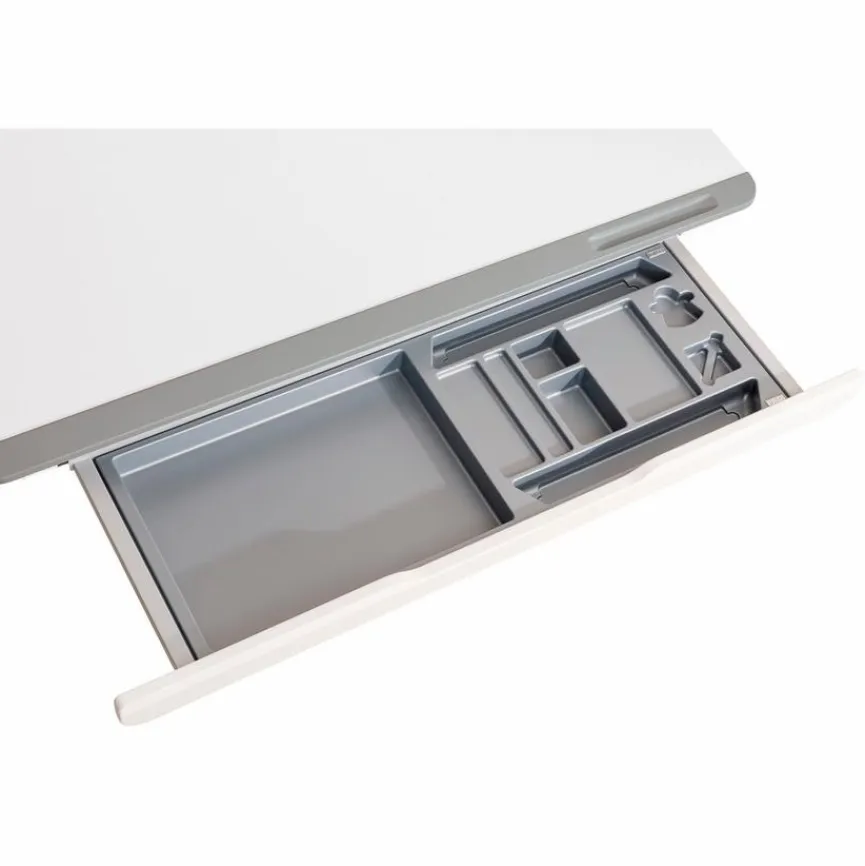 - Griffblende aus massiver und weiß lackierter Buche, Auszug aus Metall, Utensilienschale aus Kunststoff in grau