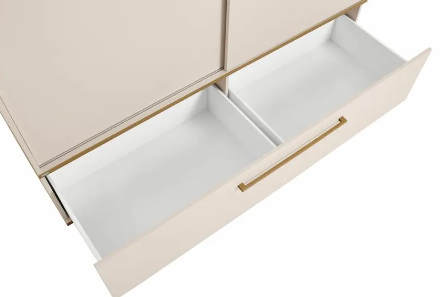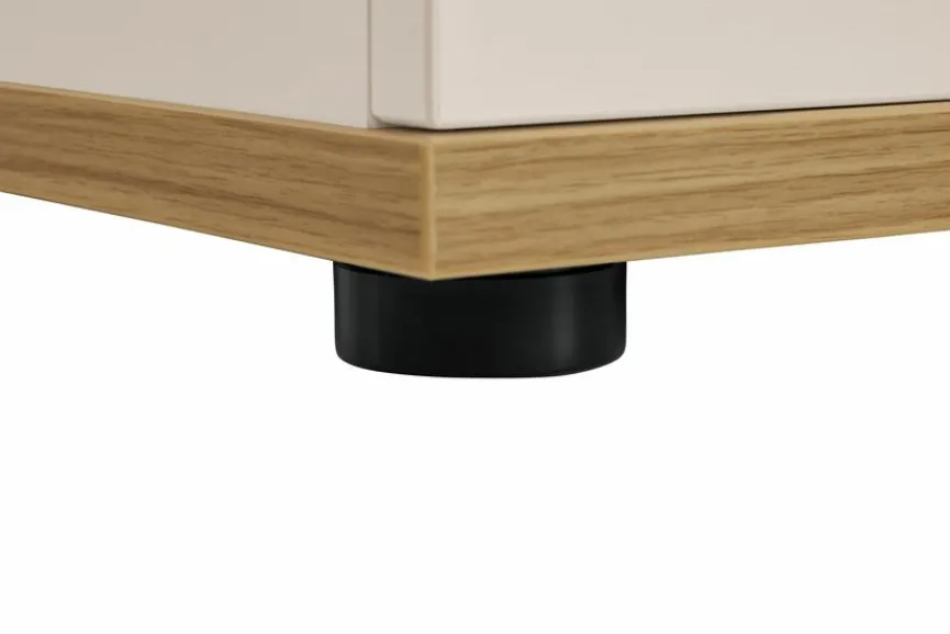 - Aus Holzwerkstoff (Spanplatte) mit kratzfester Melaminharzfolie in Cashmere-Beige, Griffe, Sockel und Deckplatte aus massiver Eiche