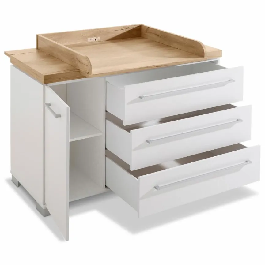 - Aus Spanplatte mit kratzfester Melaminharzfolie in Kreideweiß, Absetzung in Eiche Nebraska