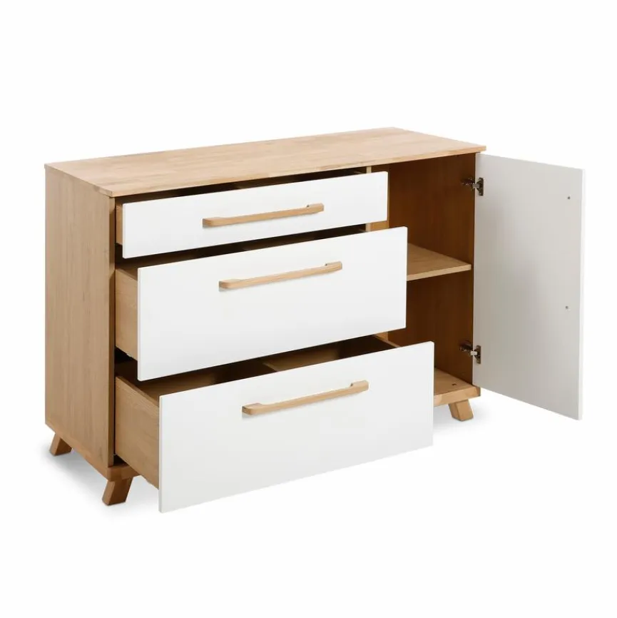- Mit 2 breiten und 1 schmalen Schubkasten und 1 Tür auf der rechten Seite mit 2 Fächern