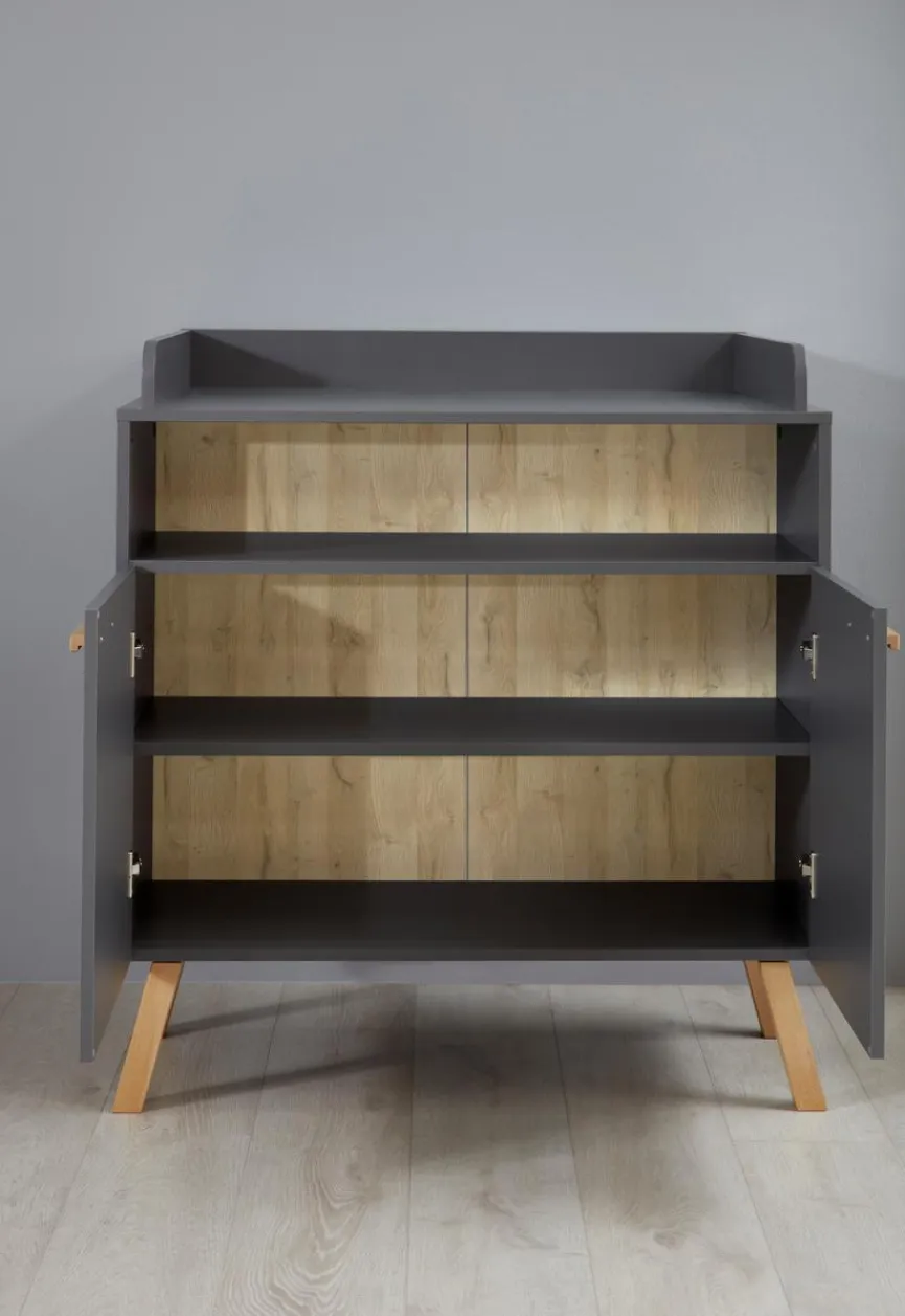 - Mit abnehmbarem Wickelaufsatz, 2 Türen, 1 Einlegeboden und 1 offenen Fach