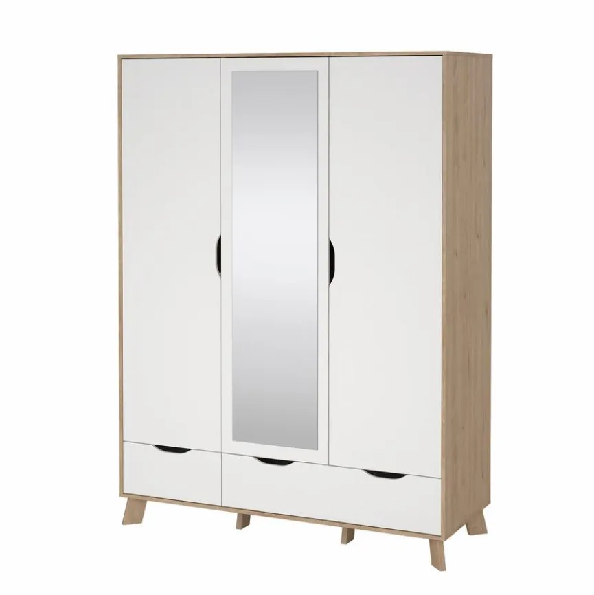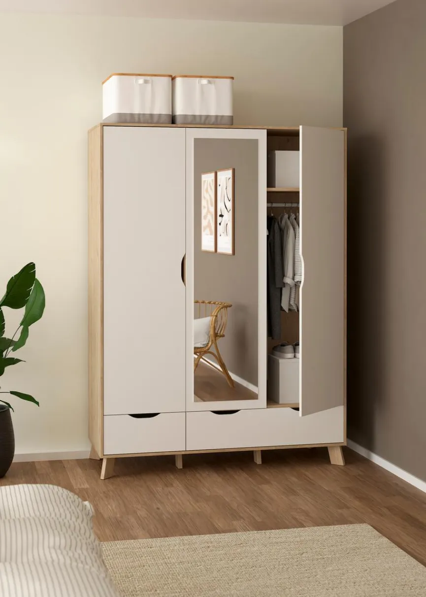 - Mit 3 Türen (davon 1 Spiegeltür), links 2 Einlegeböden und 1 Konstruktionsboden, rechts 1 Konstruktionsboden, 1 Kleiderstange und 2 Schubkästen