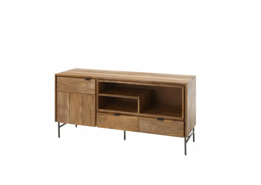 Lowboard Shiva nennt sich das moderne Möbel, das Ihr Wohnzimmer verschönert. Dafür sorgt die angesagte Holzoptik, die mit trendigen Industrial-Elementen kombiniert wurde. Sie können beispielsweise Ihren Fernseher auf das Sideboard stellen und in den Schubladen Ihre DVDs unterbringen. Aber auch in der Diele oder im Schlafzimmer findet das Lowboard Shiva seine Bestimmung, indem es toll aussieht und Stauraum für allerlei Kleinigkeiten bietet.