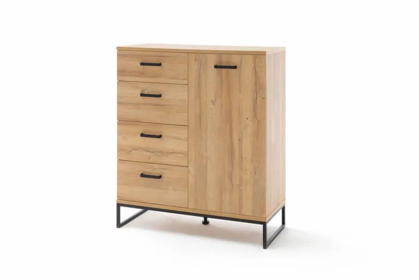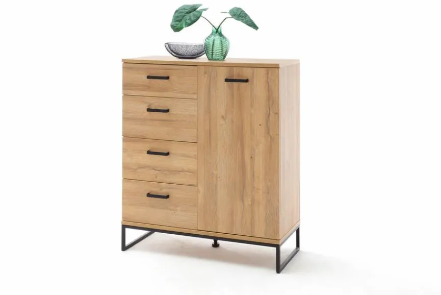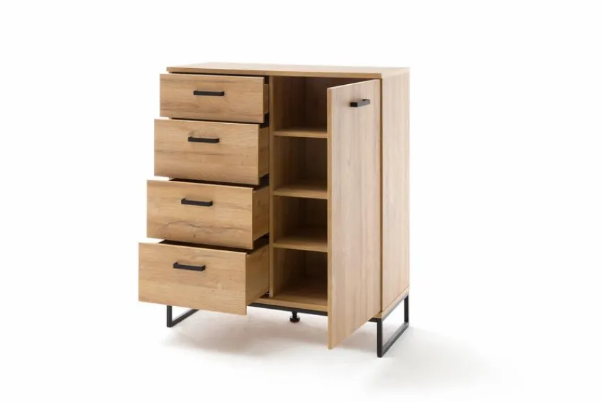 Die Kommode Toledo aus dem Hause MCA verkörpert zeitgemäße Sachlichkeit, verfügt aber auch über gemütliche Designmerkmale. Der Korpus und die Front der Kommode Toledo von MCA bestehen aus Grandson Oak Melamin, während die bügelförmigen Griffe sowie das Gestell in einem herrlich matten Schwarz gehalten sind.