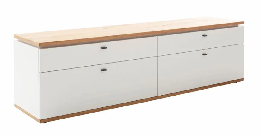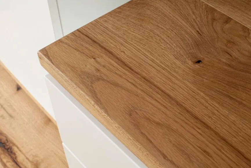 - Korpus und Front aus Holzwerkstoff (Spanplatte) mit Lack in Soft White, Absetzung aus Holzwerkstoff (Spanplatte) Ast/Balkeneiche furniert in Wildeiche geölt