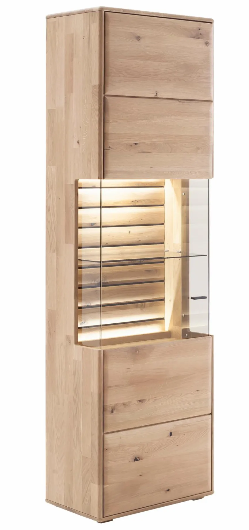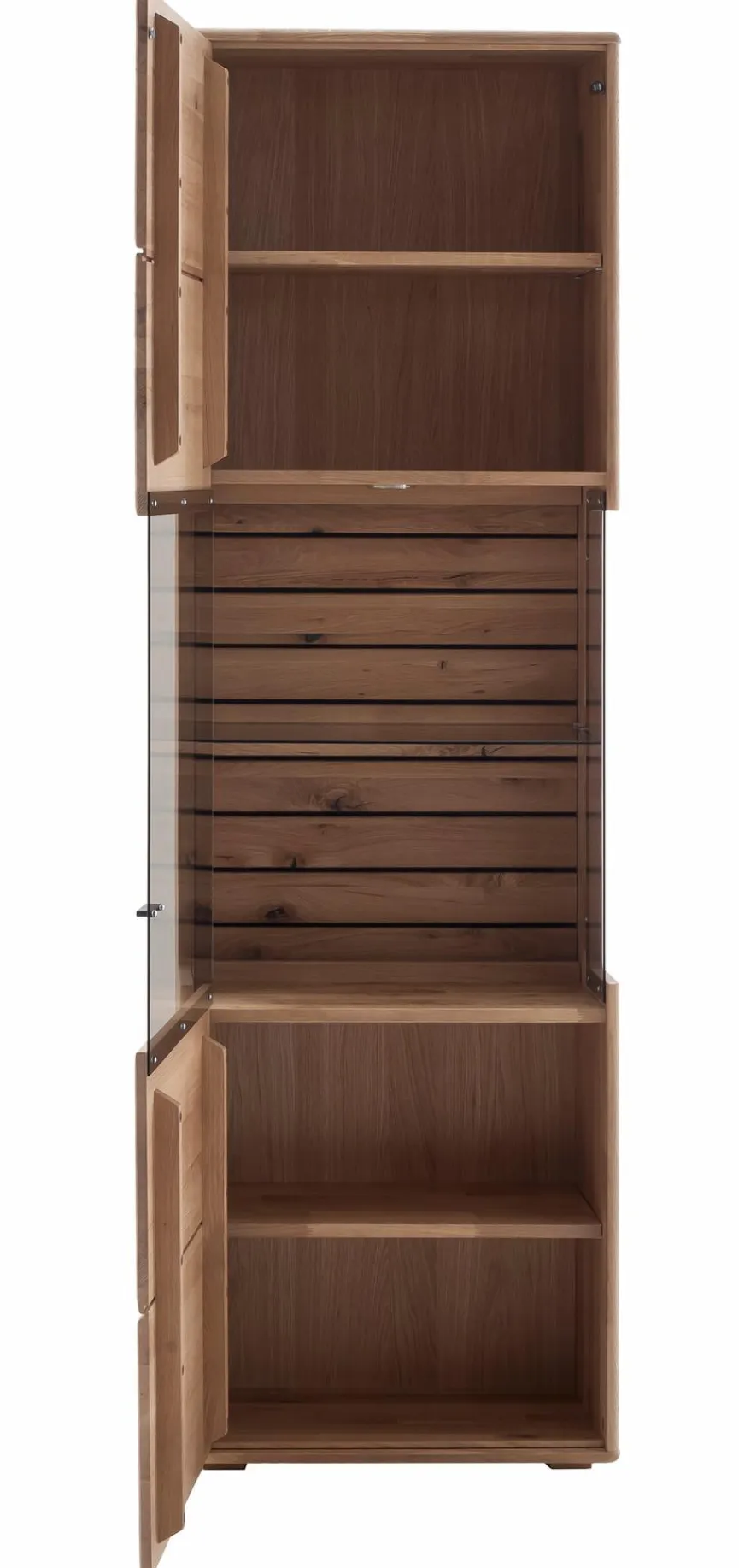 - Sichtbare Rückwand aus Ast/Balkeneiche Leisten massiv in Kristalleiche geölt mit Schattenfuge, Rückwand aus Ast/Balkeneiche furniert in Kristalleiche geölt, Frontglas aus ESG Parsol braun, Griffe aus Metall in Anthrazit