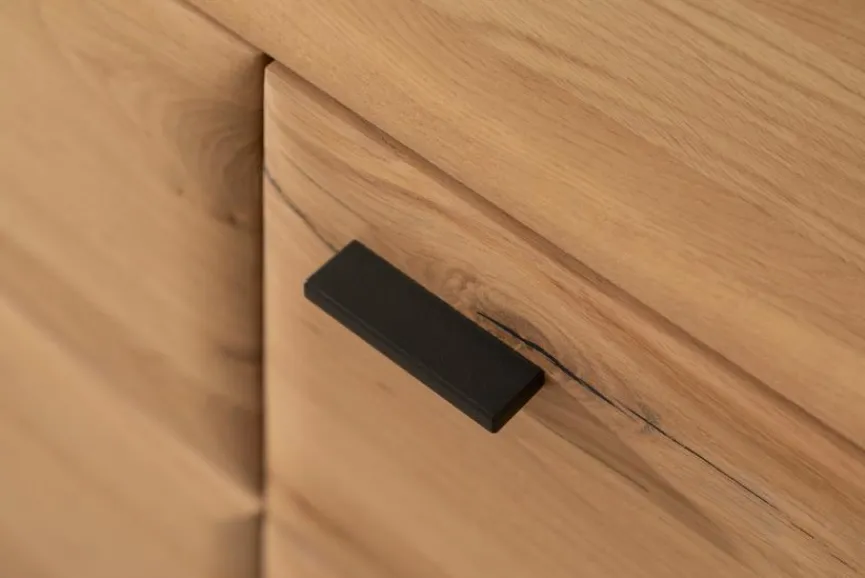 - Korpus aus Ast/Balkeneiche massiv keilgezinkt in Kristalleiche geölt, Front aus Ast/Balkeneiche massiv durchgehende Lamelle in Kristalleiche geölt