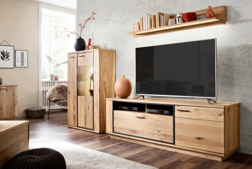 Die Wohnwand Campinas 3tlg. besteht aus einem großzügigen TV-Lowboard, einem Vitrinenschrank und einem Wandregal. Die Oberfläche ist aus Eiche Dekor und verleiht Ihrem Wohnzimmer einen gemütlichen, rustikalen Look. Und das Beste – Die Wohnwand Campinas 3tlg. Bietet ausreichend Stauraum für all Ihre Lieblingsdinge.