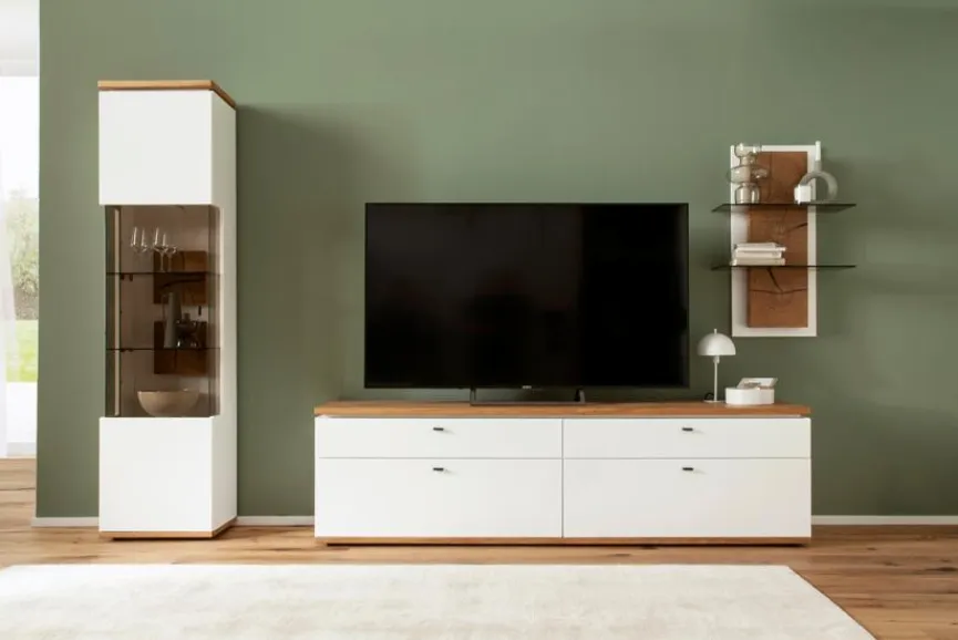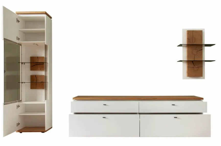 - Bestehend aus Vitrine, TV-Lowboard und Wandregal
