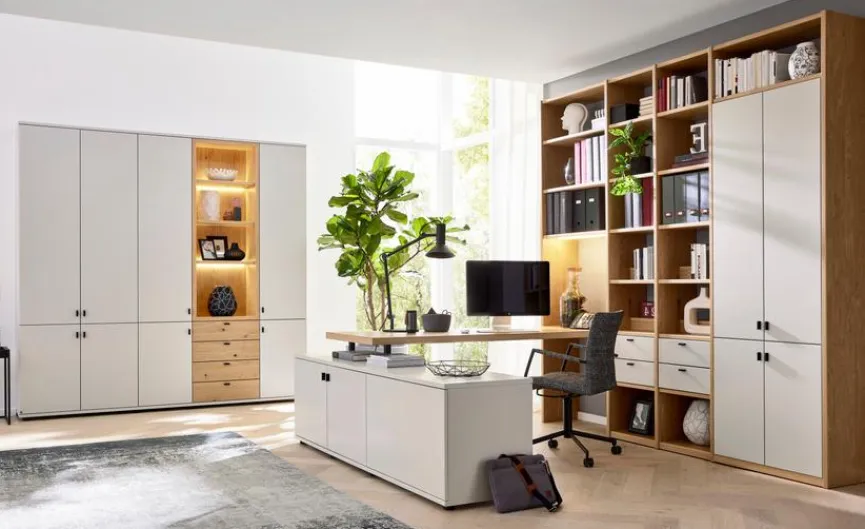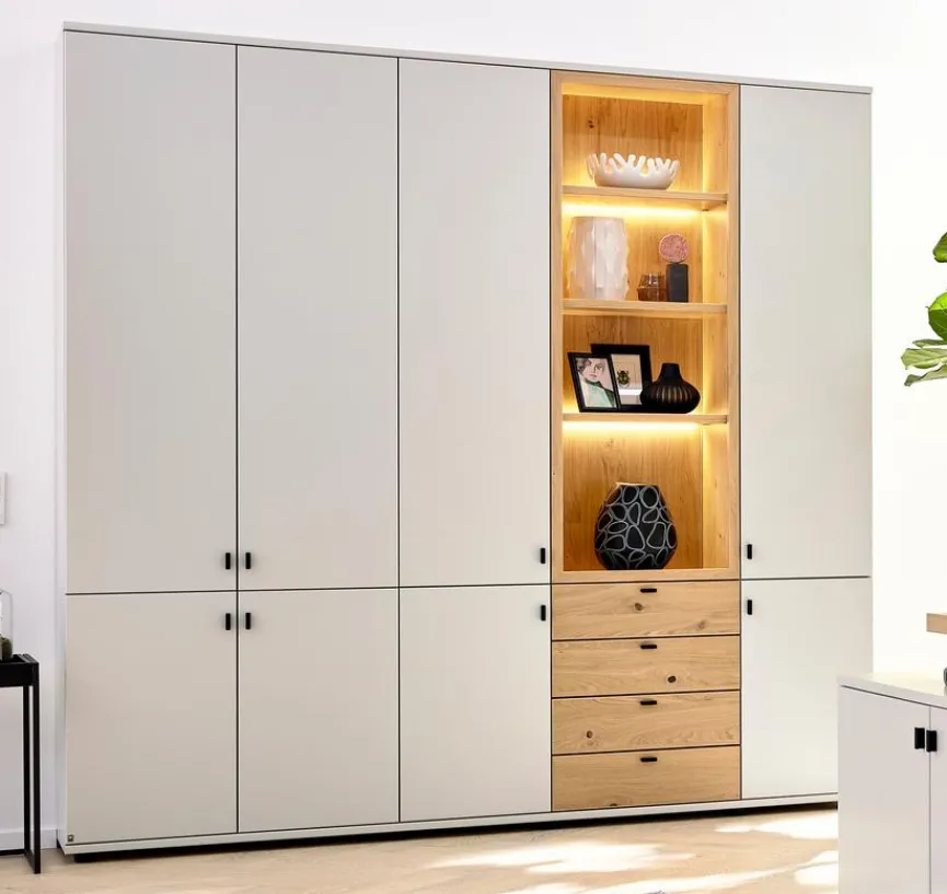 Mit der Wohnwand Kira-System der Marke Musterring verleihen Sie Ihren Wohnräumen ein ebenso wertiges wie trendbewusstes Flair. Hinter vier Türen finden Sie jede Menge Stauraum für Nützliches und Liebgewonnenes, zusätzlich bietet Ihnen die verglaste Vitrine vier Fächer, um Ihre Schmuckstücke in Szene zu setzen. Gemeinsam mit vier Schubkästen sorgt die Wohnwand Kira-System so im Handumdrehen für mehr Ordnung.