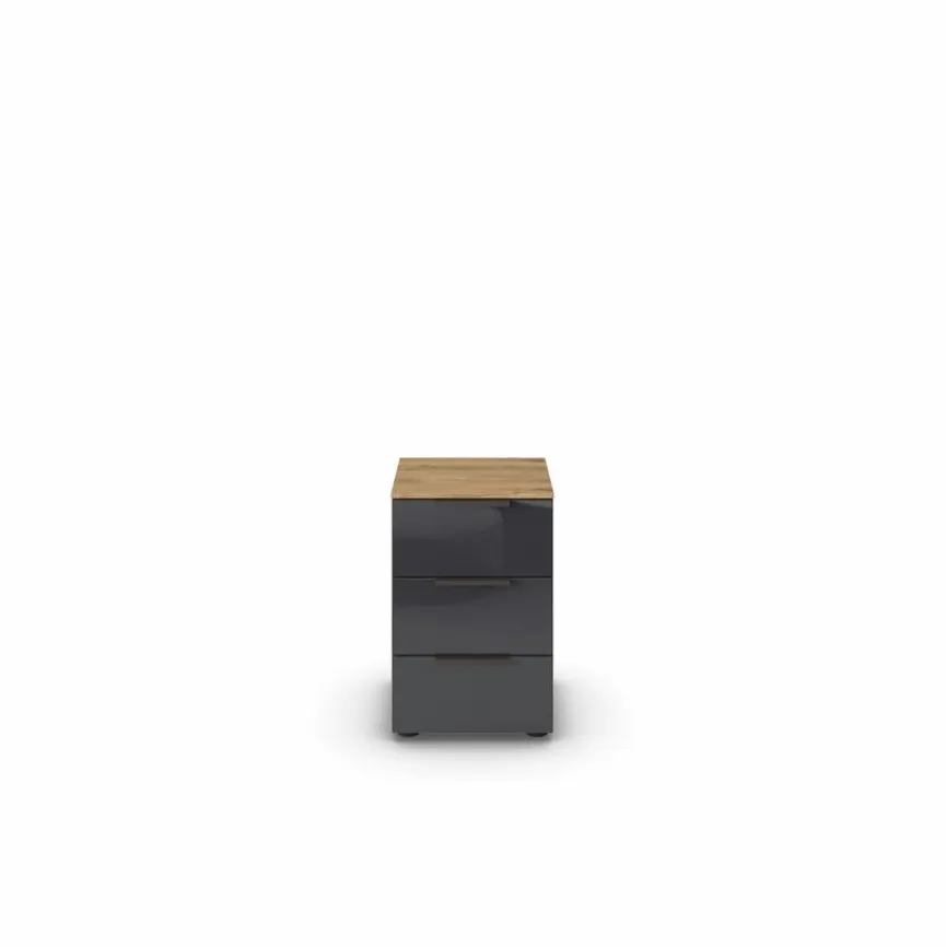 Mit drei Schubladen bietet die Nachtkommode Flipp reichlich Platz für Bücher, Zeitschriften oder etwa Hygieneartikel. Doch dieser Nachttisch ist nicht nur ungemein praktisch, er ist auch ein ästhetischer Gewinn für Ihr heimisches Schlafzimmer. Vor allem das geschmackvolle Zusammenspiel der Oberfläche in Holzoptik mit den schicken Spiegelgläsern verleiht der Nachtkommode Flipp ein ausgesprochen attraktives Erscheinungsbild.