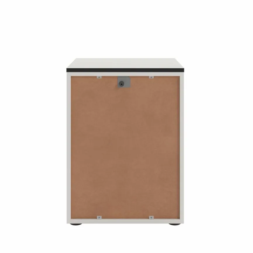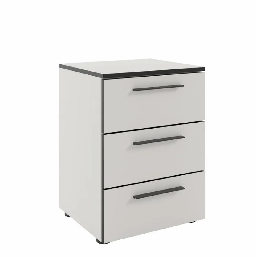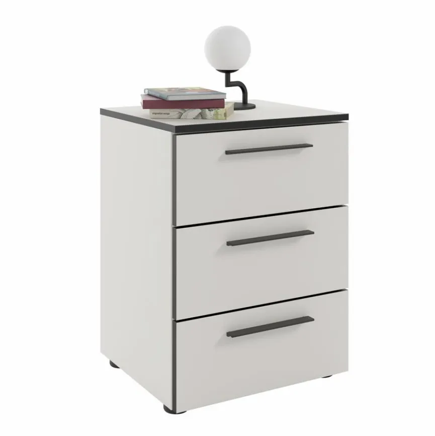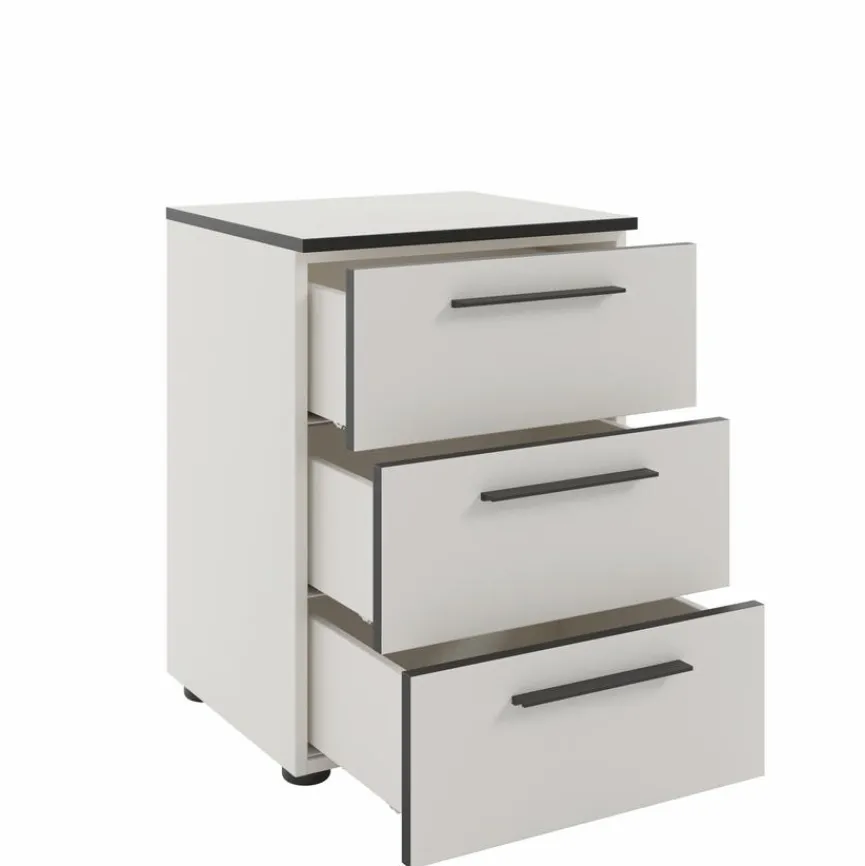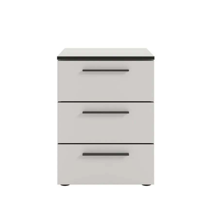 Die Nachtkommode Soul besitzt durch ihre Melaminharzbeschichtung eine kratzfeste und pflegeleichte Oberfläche. Dieser Nachttisch bietet mit den drei Schubladen auf Unterflurauszügen mit gedämpftem Selbsteinzug praktischen Stauraum, der durch Metallgriffe und eine dezente ABS?Kante stilvoll ergänzt wird. Die Nachtkommode Soul beweist dank der verstellbaren Bodengleiter und der Kippsicherung zudem eine vielseitige Anpassungsfähigkeit.